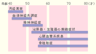 頭痛、頭重、不眠、憂うつ、イライラ、めまい、耳鳴りなどがあります。女性ホルモンの分泌低下に加えて、家庭での悩みや環境の変化、老化などへの不安など、心理的、社会的なことが原因であることが少なくありません。